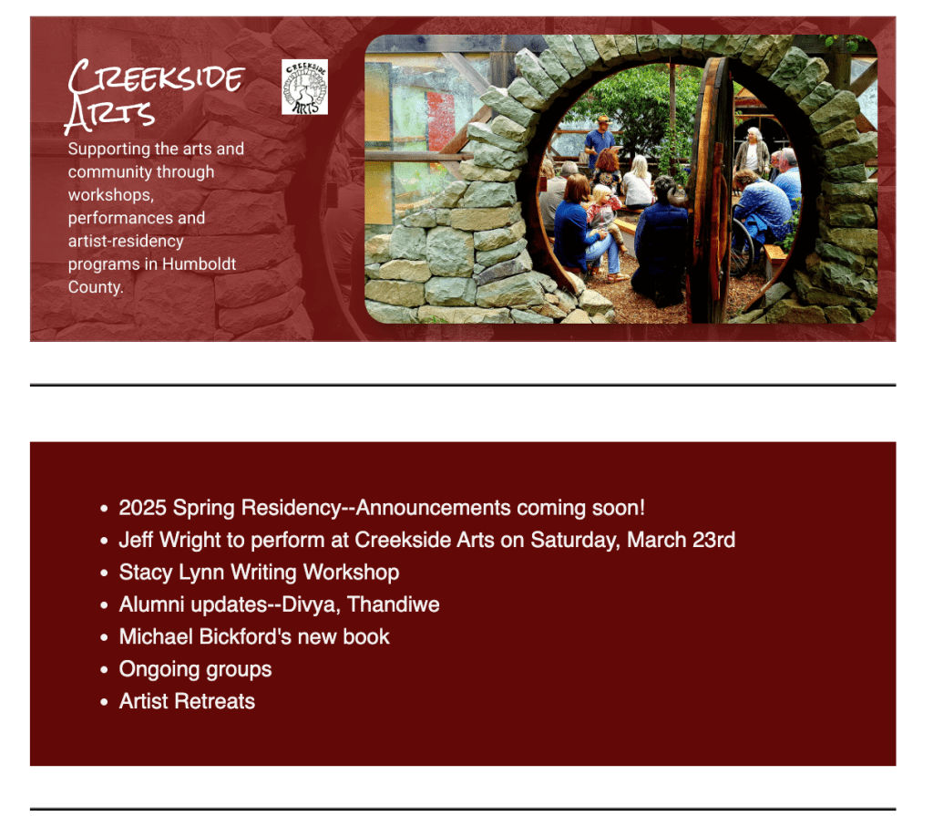 Thorgoughly enjoyed my time in this majestic redwooded corner of the earth, and looking forward to a return in the future. THANK YOU Creekside Arts!!